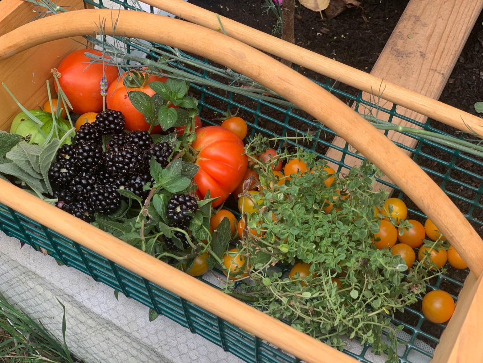 The harvest is in full swing and each day we collect a little basket of goodies to enjoy. Today we have some blackberries, heirloom tomatoes, cherry tomatoes, plum tomatoes, chocolate mint, fresh thyme, sage, lavender flowers and dill. What delicious haul!
